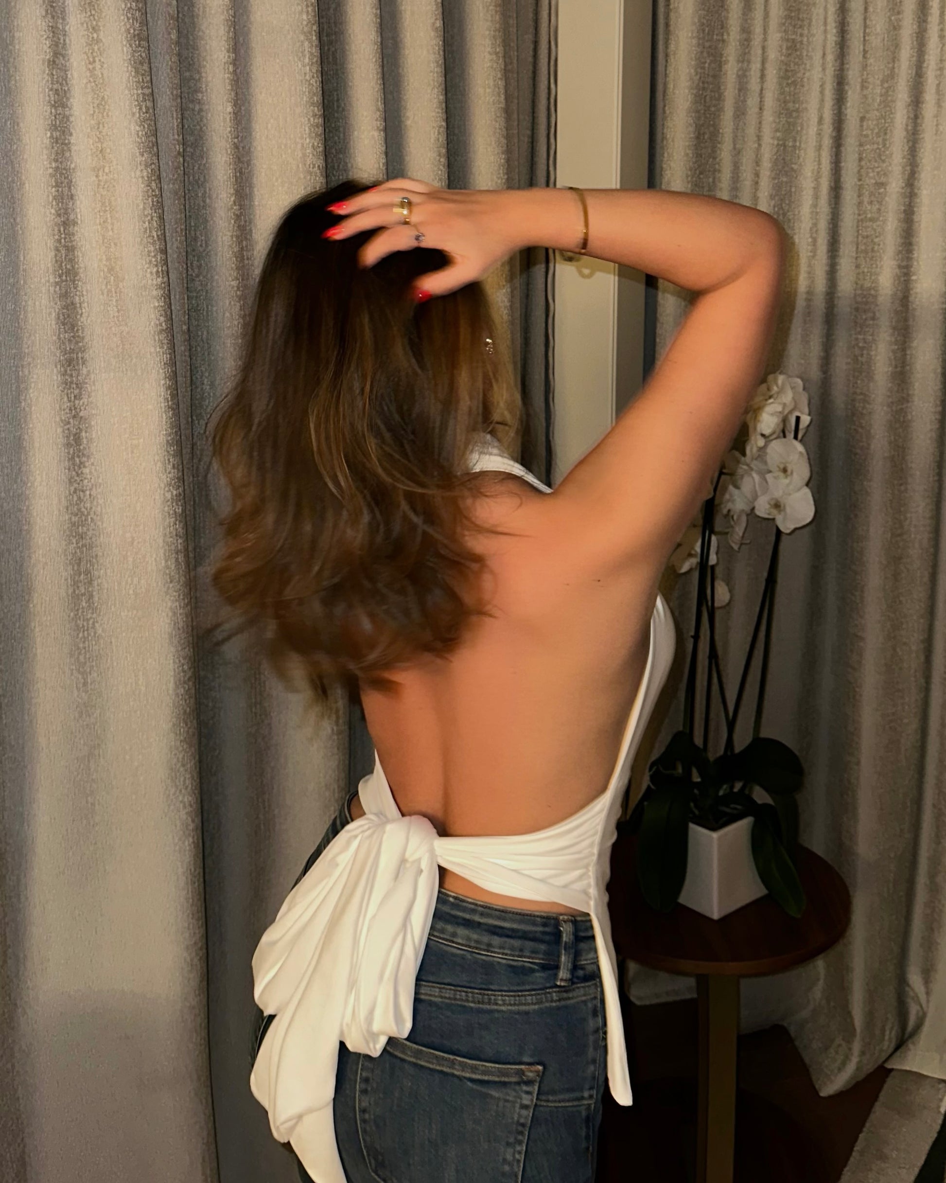 Este top halter tiene un drapeado elegante con un escote profundo que hace que sea muy favorecedor. She´s such a doll top es convertible, muy versátil y se puede usar de muchas maneras. Además el lazo de gran tamaño en la espalda aporta el dramatismo que necesitas. Elaborado con una atención al detalle incomparable.