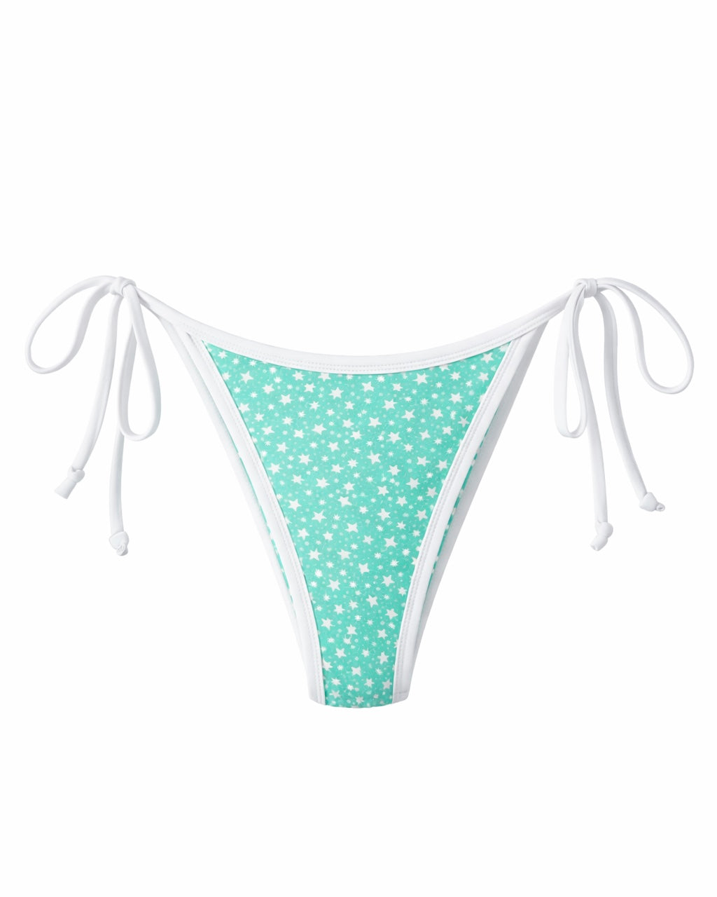 This adjustable string bikini bottom features delicate white stars over soft mint lycra, creating a fresh and eye-catching look.