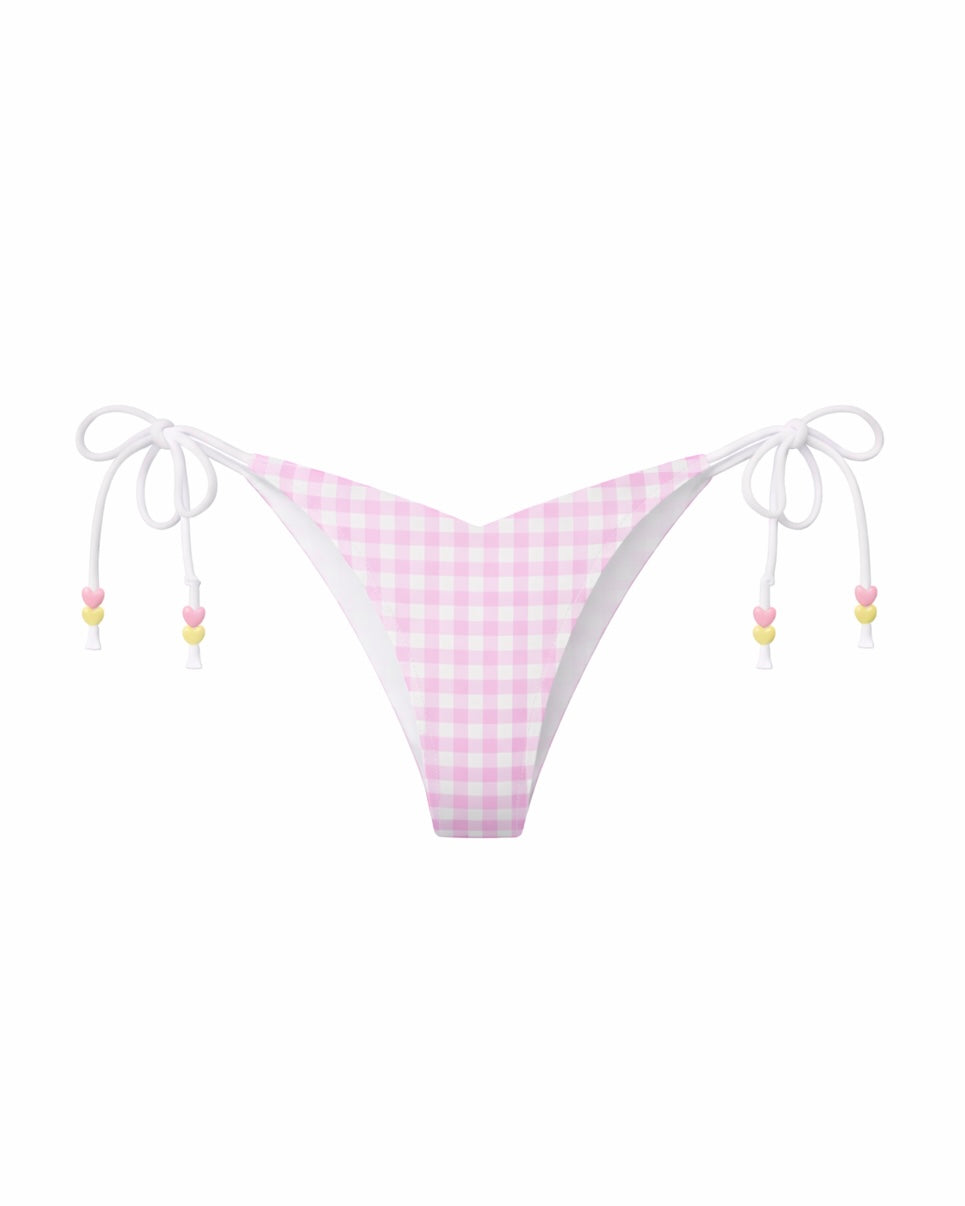 The Gigi bottom continues the delicate gingham story with a flattering V-cut front that enhances and elongates the silhouette. Adjustable white side ties allow for a customized fit at the hips.