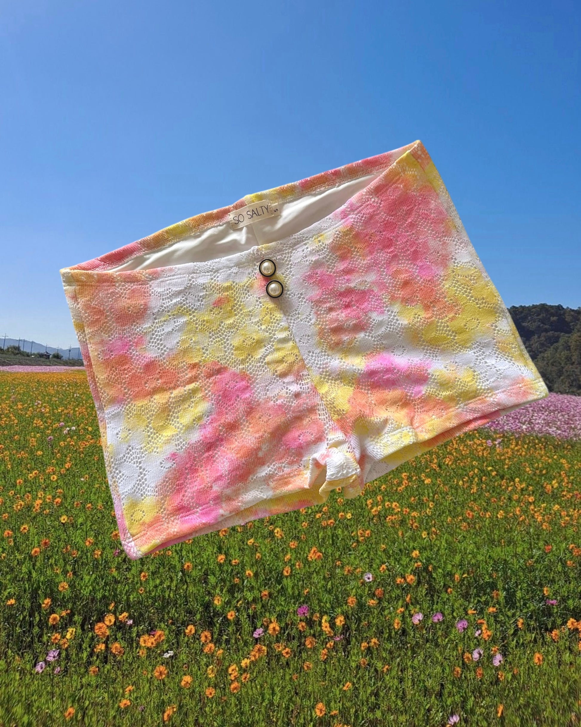 These shorts are made from high-quality tie dye flowery lace fabric and lined with lycra fabric that gives support and coverage. The vintage style buttons give this garment a fun touch. With these shorts you will be both, comfortable and look cute all the summer.