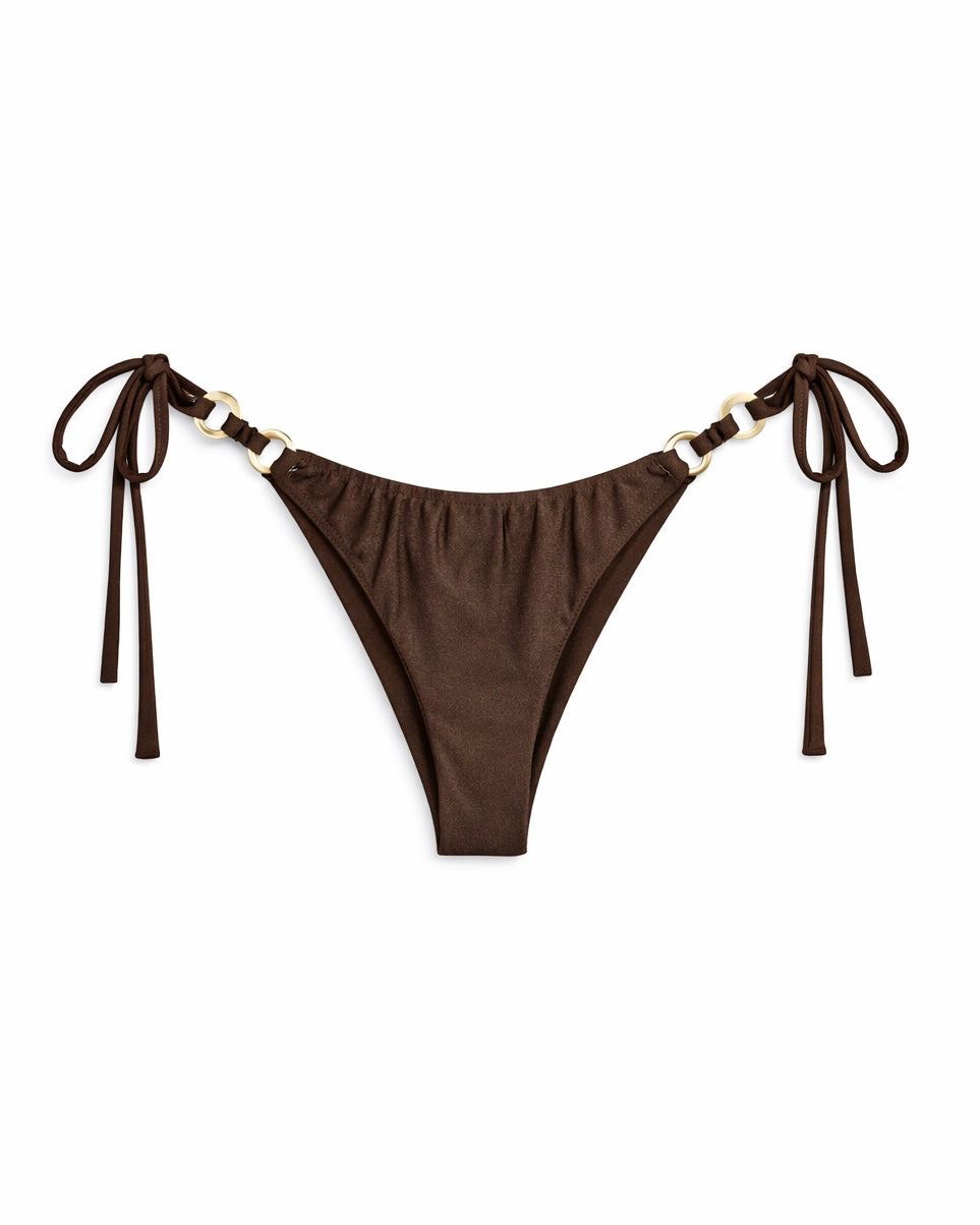 El bottom Vittoria Espresso continúa el mismo lenguaje de diseño con pitas laterales ajustables terminadas en aros de concha natural. Con el cheeky cut característico de So Salty, abraza y realza las curvas naturales con precisión effortless.