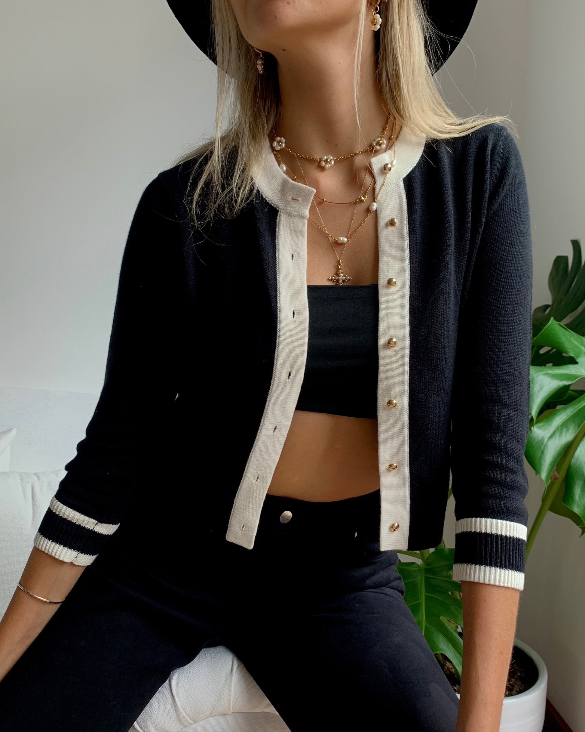 "Who is she?" cardigan es una prenda atemporal y hecha con fibras 100% naturales; hilo de algodón peruano. Lo que las convierte en prendas de calidad A1 y timeless, es decir duraderas. Con un diseño clásico de contraste de colores estilo Chanel vintage y con sofisticados y delicados botones dorados.
